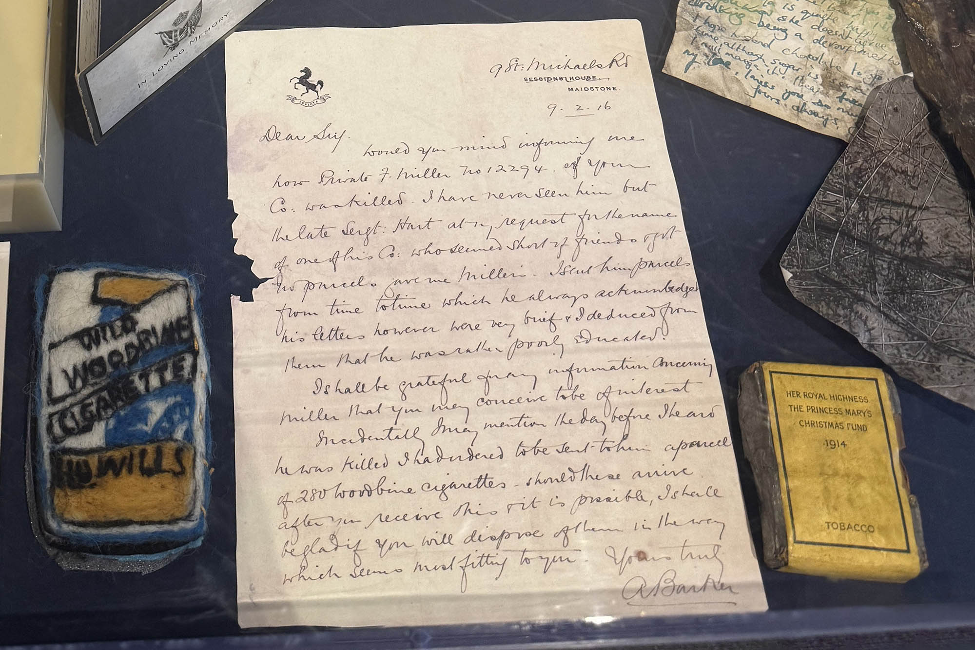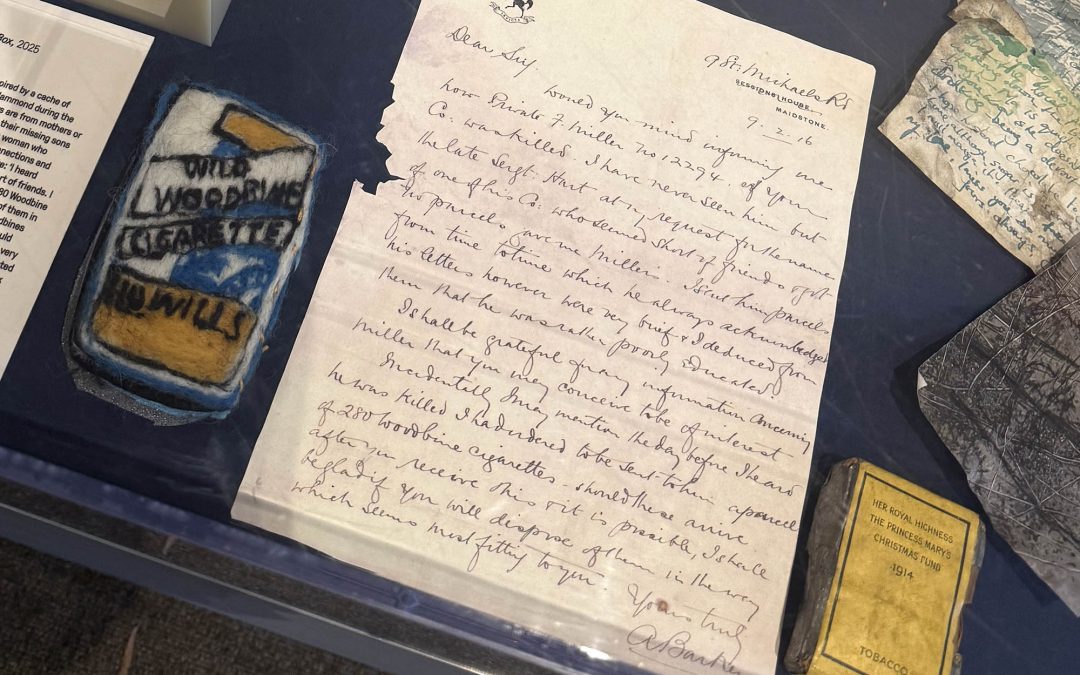 ‘Woodbine Cigarette Box’ is inspired by a cache of letters addressed to Captain J Hammond during the First World War. Most of the letters are from mothers or wives asking for information about their missing sons or husbands. But one letter is from a woman who befriended soldiers without family connections and sent them parcels and letters. She wrote: ‘I heard Private F Miller was killed. He seemed short of friends. I had ordered to be sent to him a parcel of 280 Woodbine cigarettes. I shall be glad if you will dispose of them in the way that seems most fitting to you’. Woodbines were smoked by most of the troops and this would have been a welcome gift.