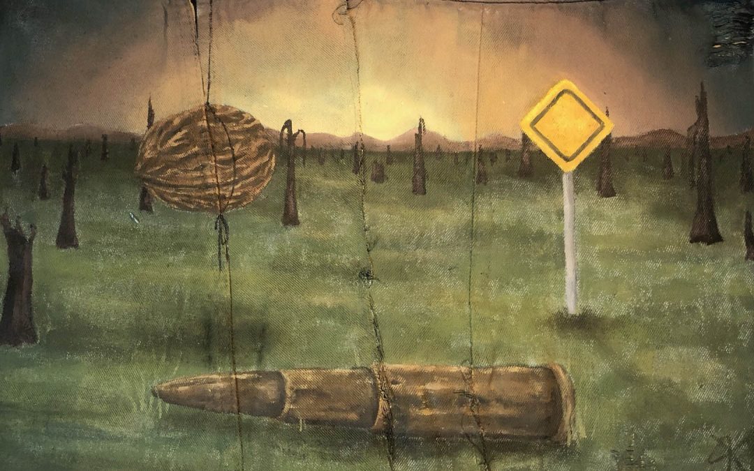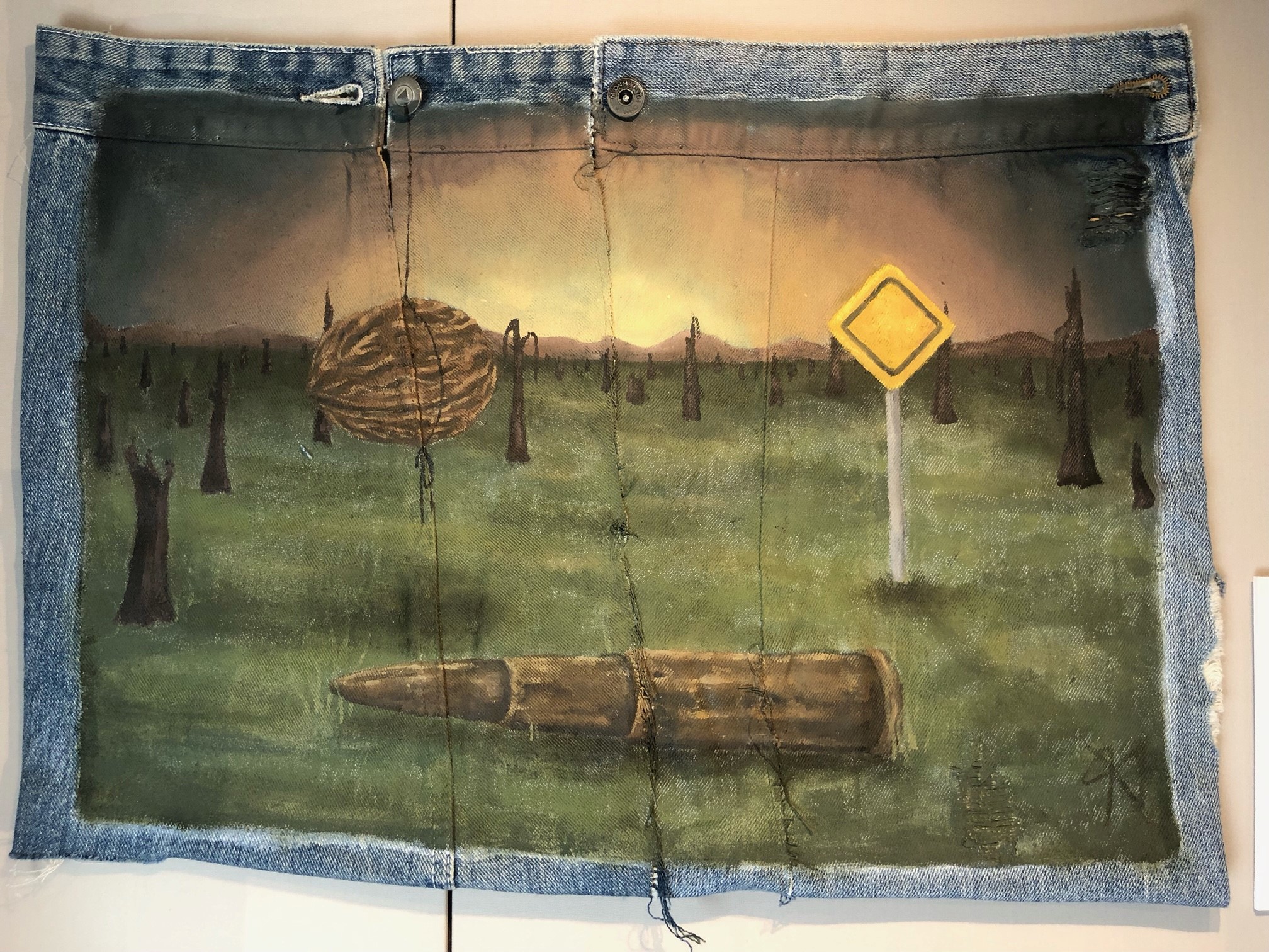 For this project I looked into the Smith Brothers’ letters and created imagery in response. My own practice is surrealism based and I’d recently been looking into war artist Paul Nash; I decided to incorporate elements of his piece ‘We Are Making a New World’ to add a sense of authenticity to my paintings as well as to try new techniques. The most important element of my practice is sustainability, and while I normally paint on discarded objects e.g. frying pans & sofa cushions, this didn’t feel appropriate for this project. To get around this I made ‘canvasses’ out of denim scraps and painted on these which, in reflection, is a slight nod to war artists improvisation when it came to materials and it helps give each piece more life and character.